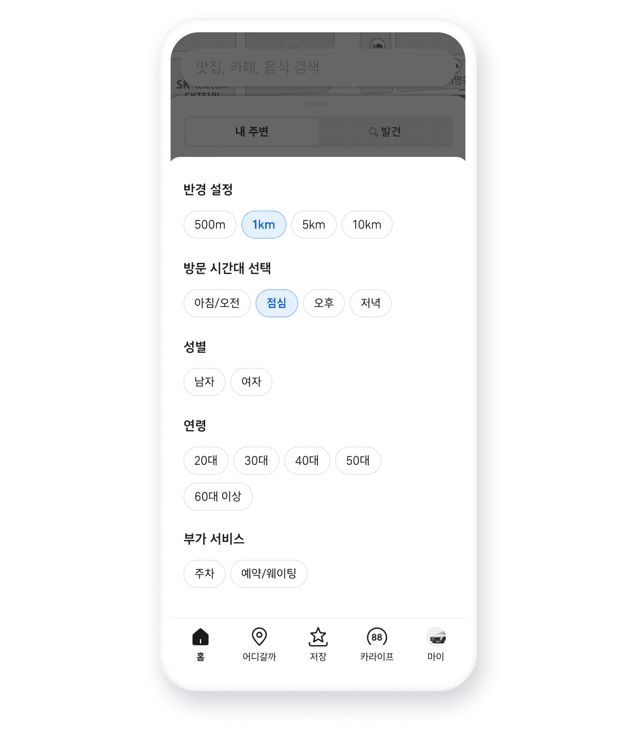 ‘내 주변’에서 필터를 통해 반경, 방문 시간, 성별, 연령, 카테고리 등 원하는 장소만 골라 탐색해보세요.